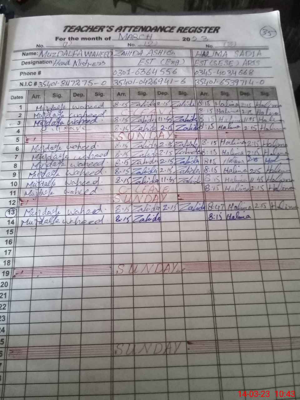 | CNIC | Full Name | Designation | R/C | Absence During Last Calender Month |
