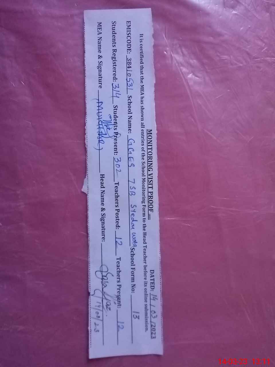 | Attendance Register | Head Teacher | MEA with School | Visit Proof |