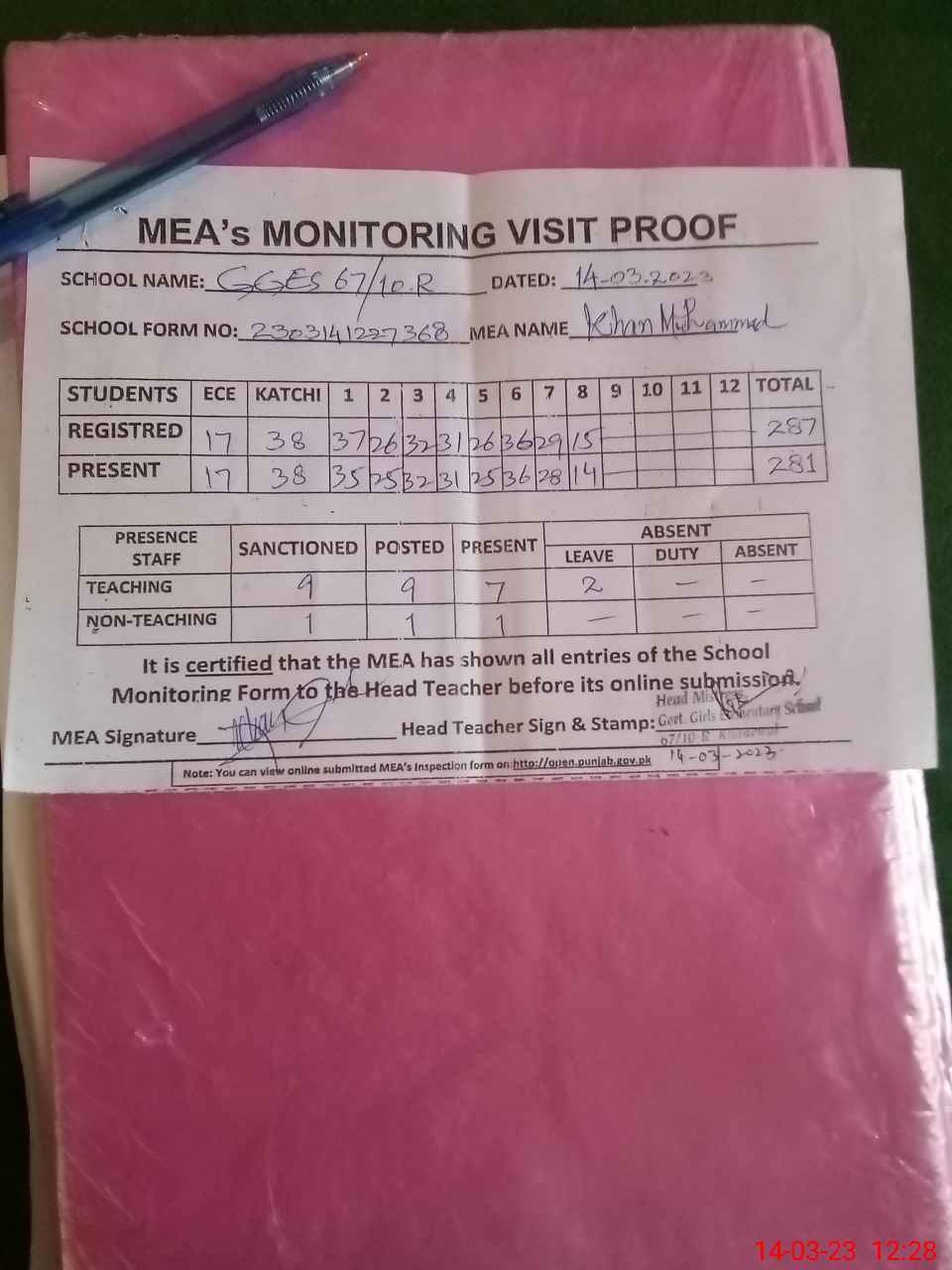 | Attendance Register | Head Teacher | MEA with School | Visit Proof |