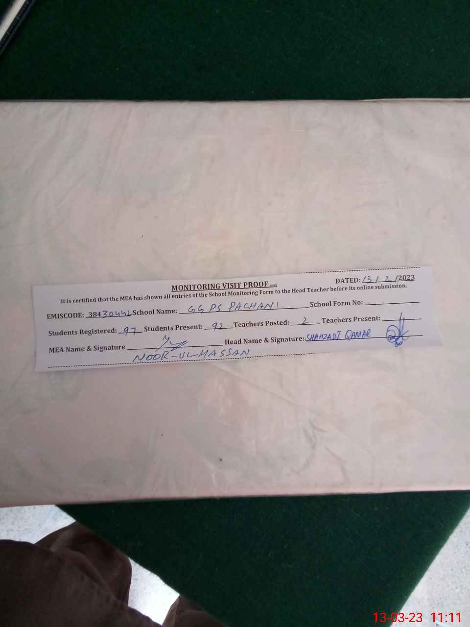 | Attendance Register | Head Teacher | MEA with School | Visit Proof |