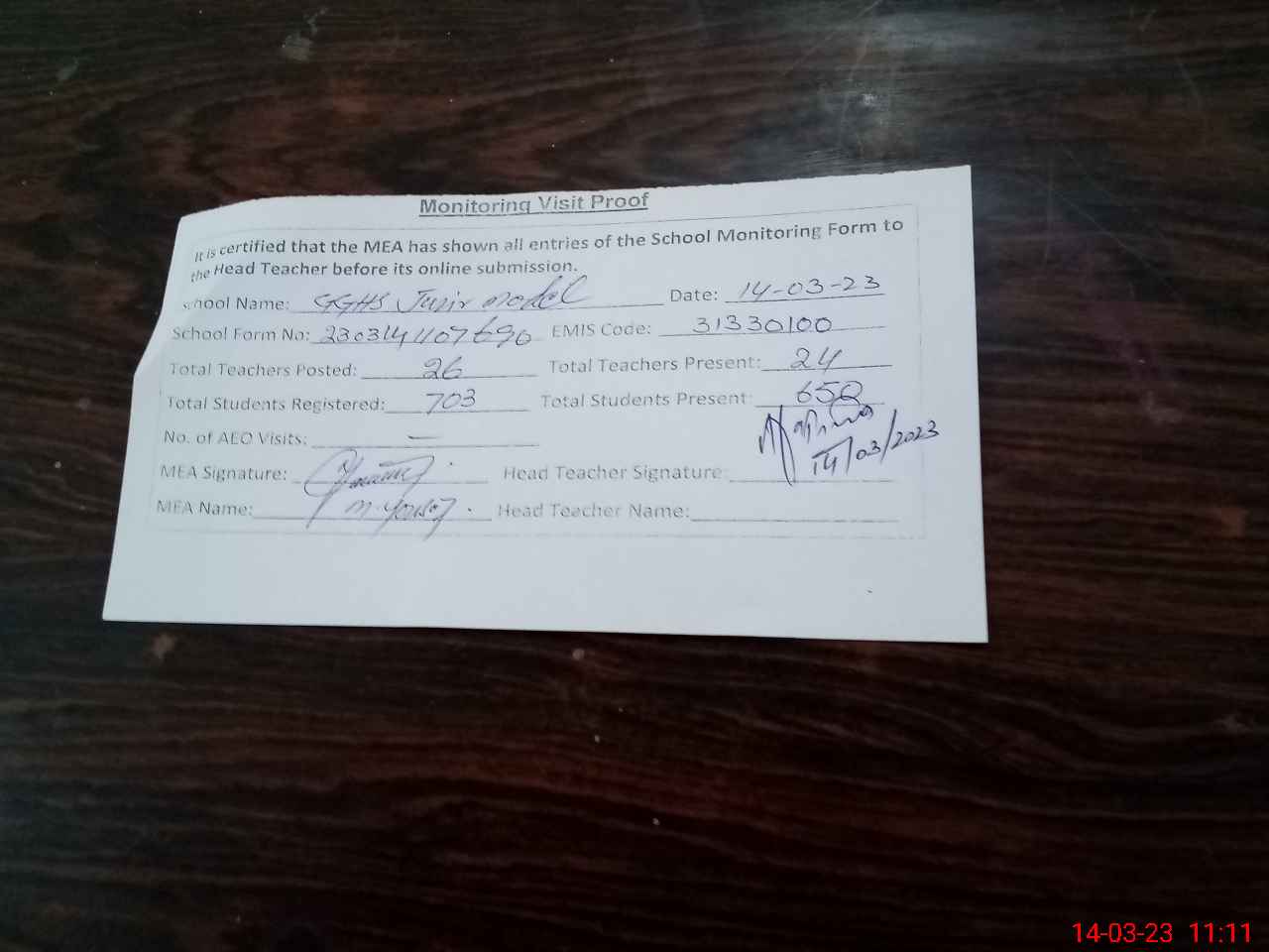 | Attendance Register | Head Teacher | MEA with School | Visit Proof |