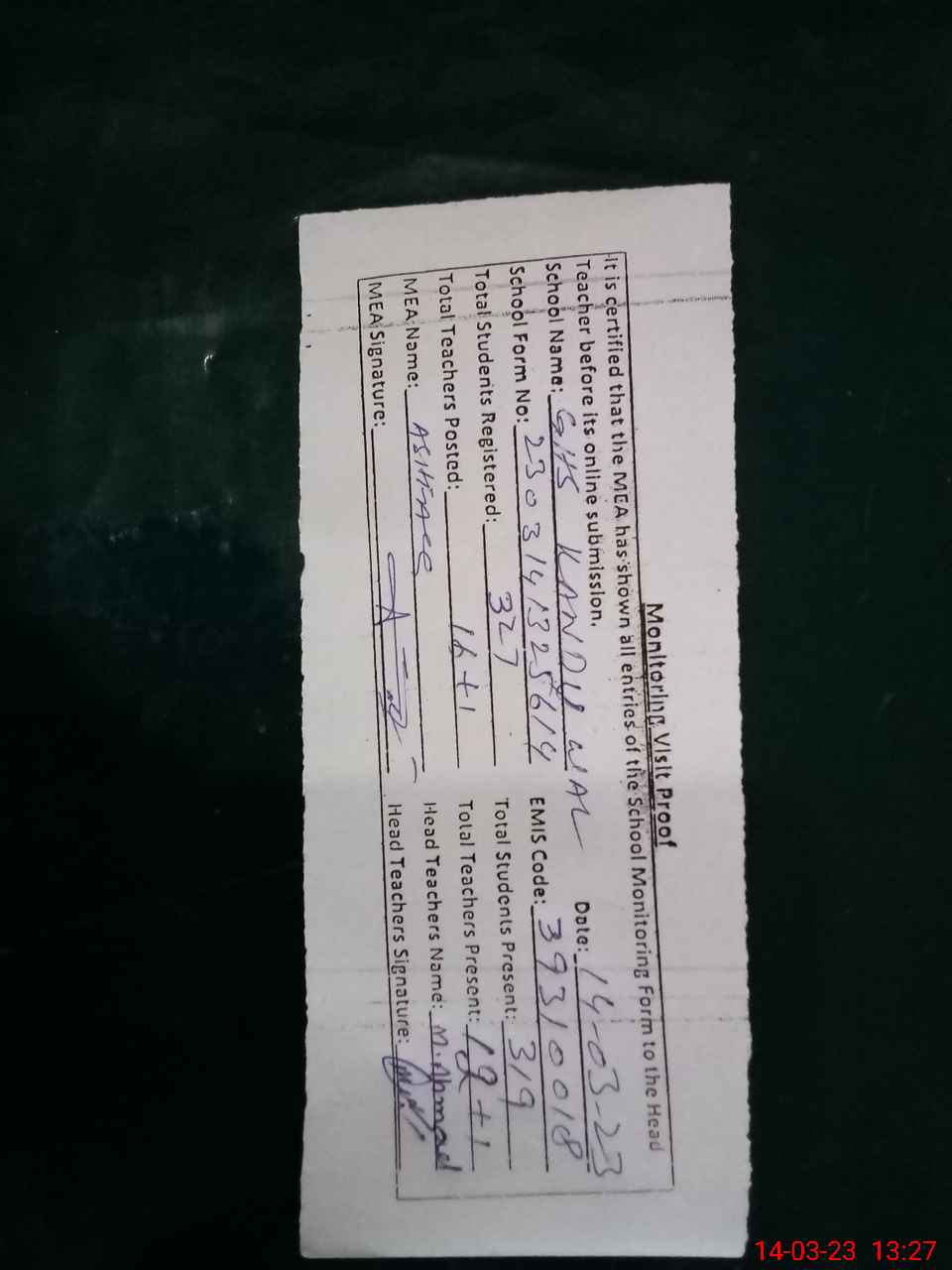 | Attendance Register | Head Teacher | MEA with School | Visit Proof |