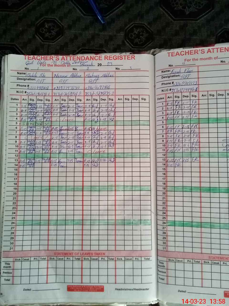 | CNIC | Full Name | Designation | R/C | Absence During Last Calender Month |