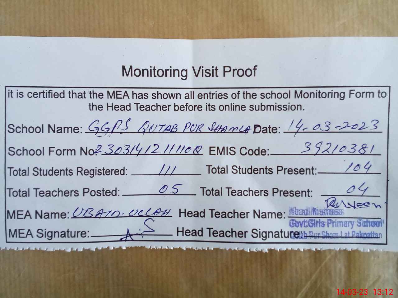 | EMIS Code: 39210381 | Name of School: GGPS QUTAB PUR SHAM LAT | |||