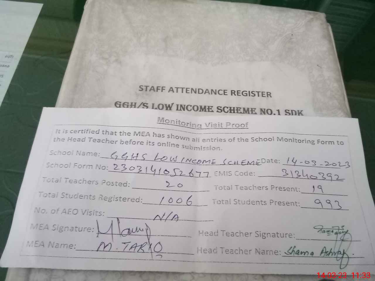 | EMIS Code: 31340392 | Name of School: GGHS LOW INCOME SCHEME NO.1 SETLLITE TOWN | |||