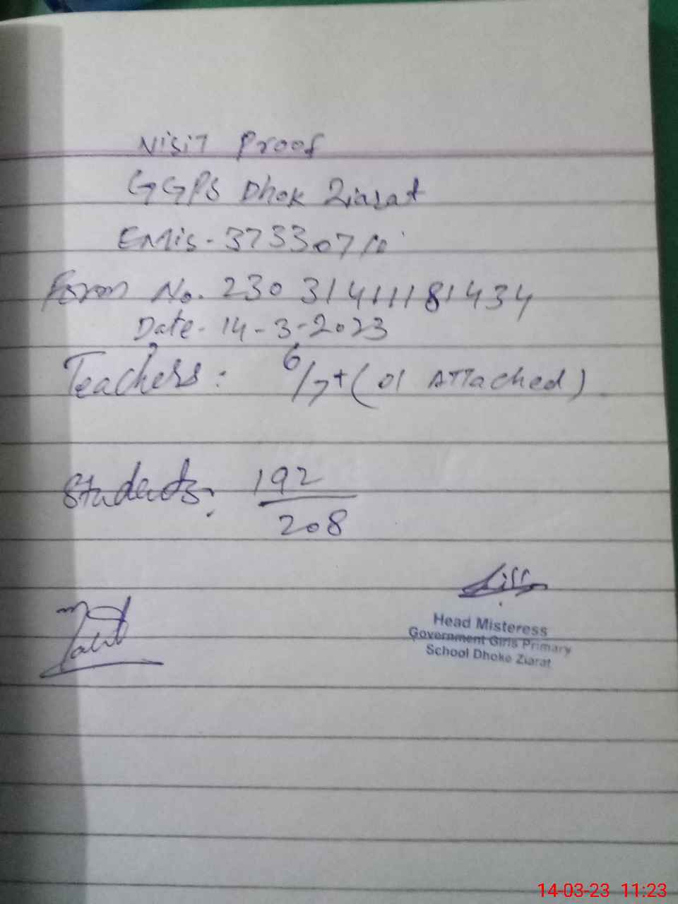 | EMIS Code: 37330710 | Name of School: GGPS DHOK ZIARAT | |||
