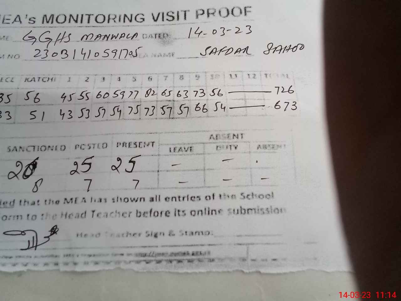 | Attendance Register | Head Teacher | MEA with School | Visit Proof |