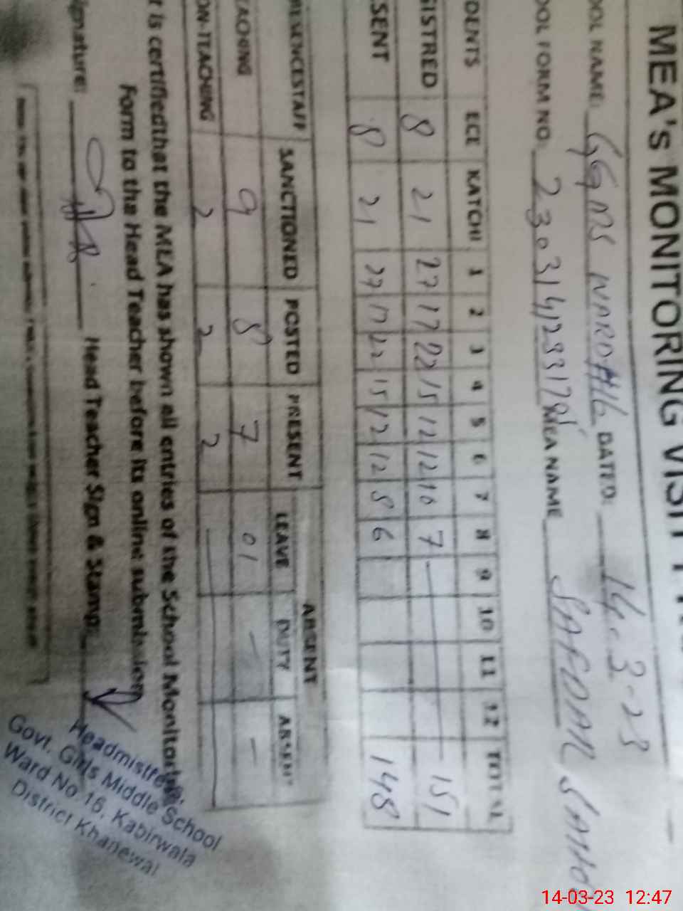 | Attendance Register | Head Teacher | MEA with School | Visit Proof |
