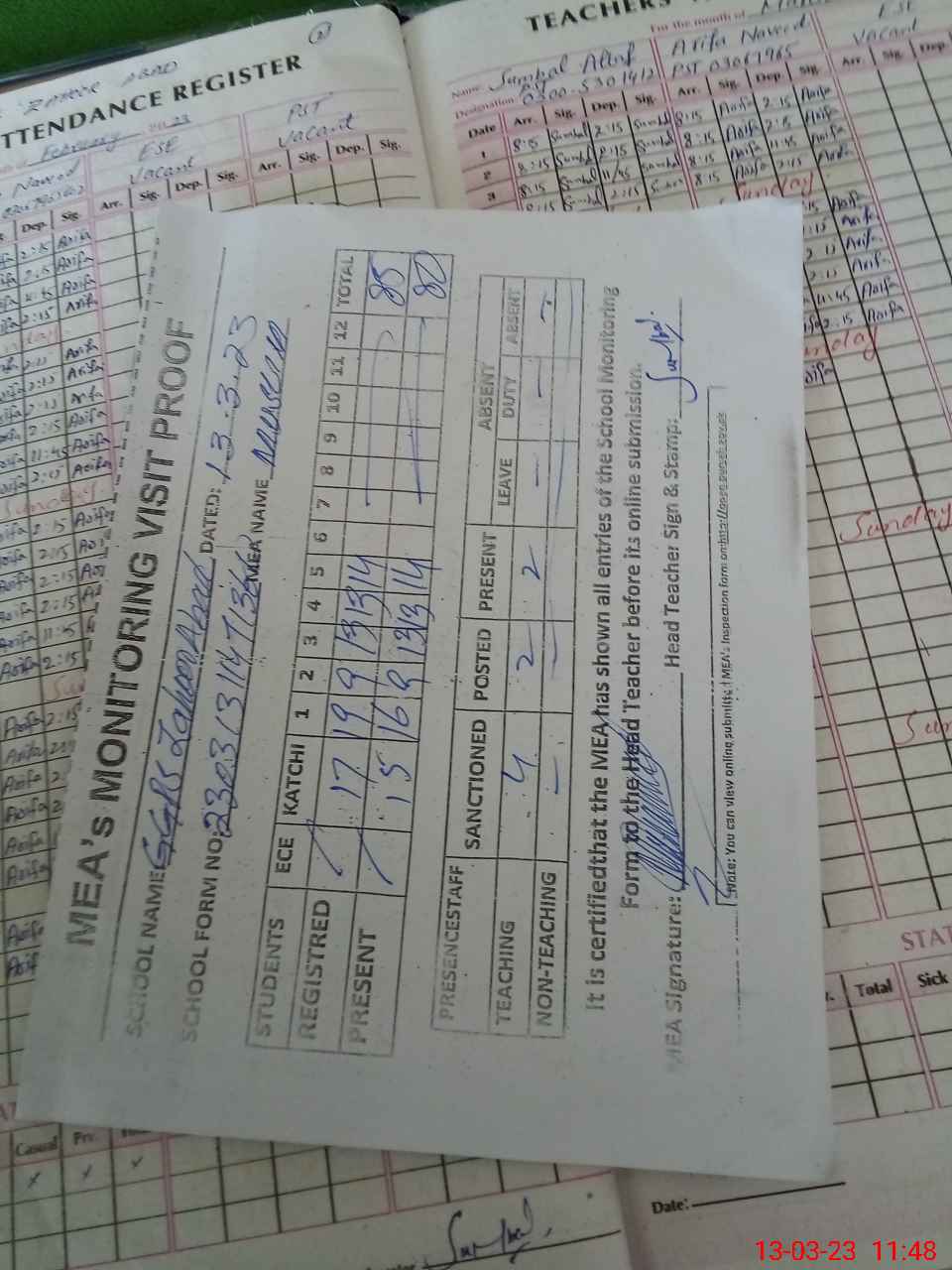| Attendance Register | Head Teacher | MEA with School | Visit Proof |