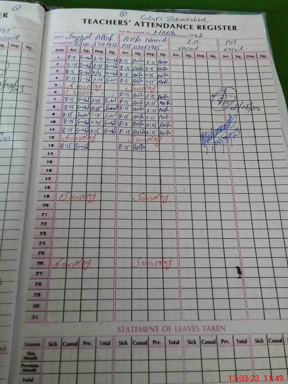 | Name: Ar**** Na**** Designation: (School Headmaster's/Headmistress's) PST Phone/Cell Number: 03**** |