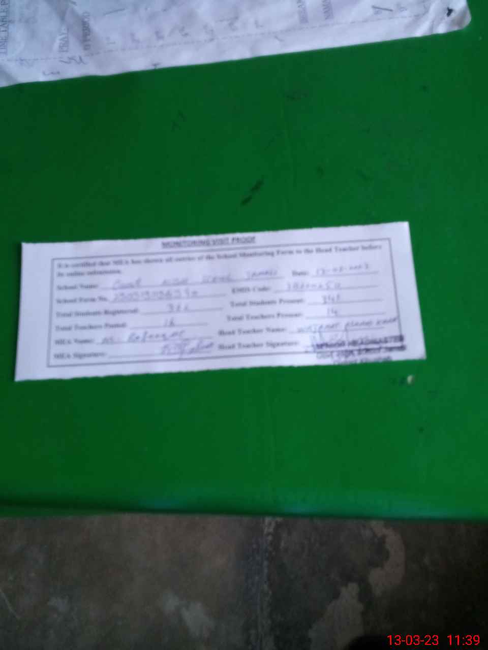 | Attendance Register | Head Teacher | MEA with School | Visit Proof |