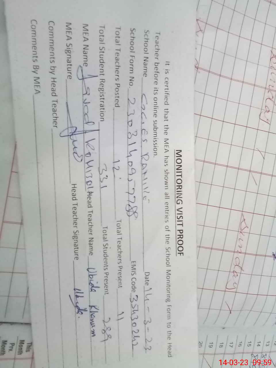 | Attendance Register | Head Teacher | MEA with School | Visit Proof |