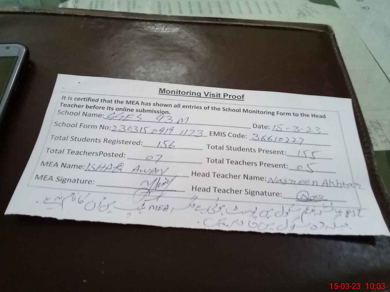 | Attendance Register | Head Teacher | MEA with School | Visit Proof |