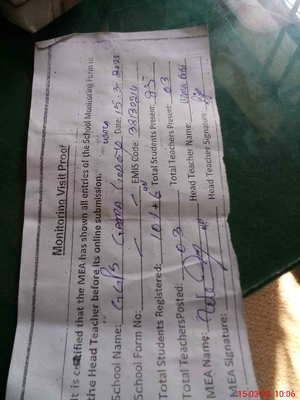 | Attendance Register | Head Teacher | MEA with School | Visit Proof |