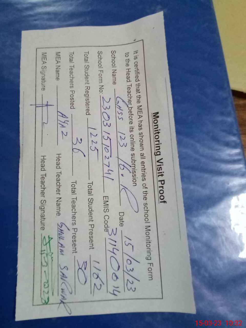 | Attendance Register | Head Teacher | MEA with School | Visit Proof |