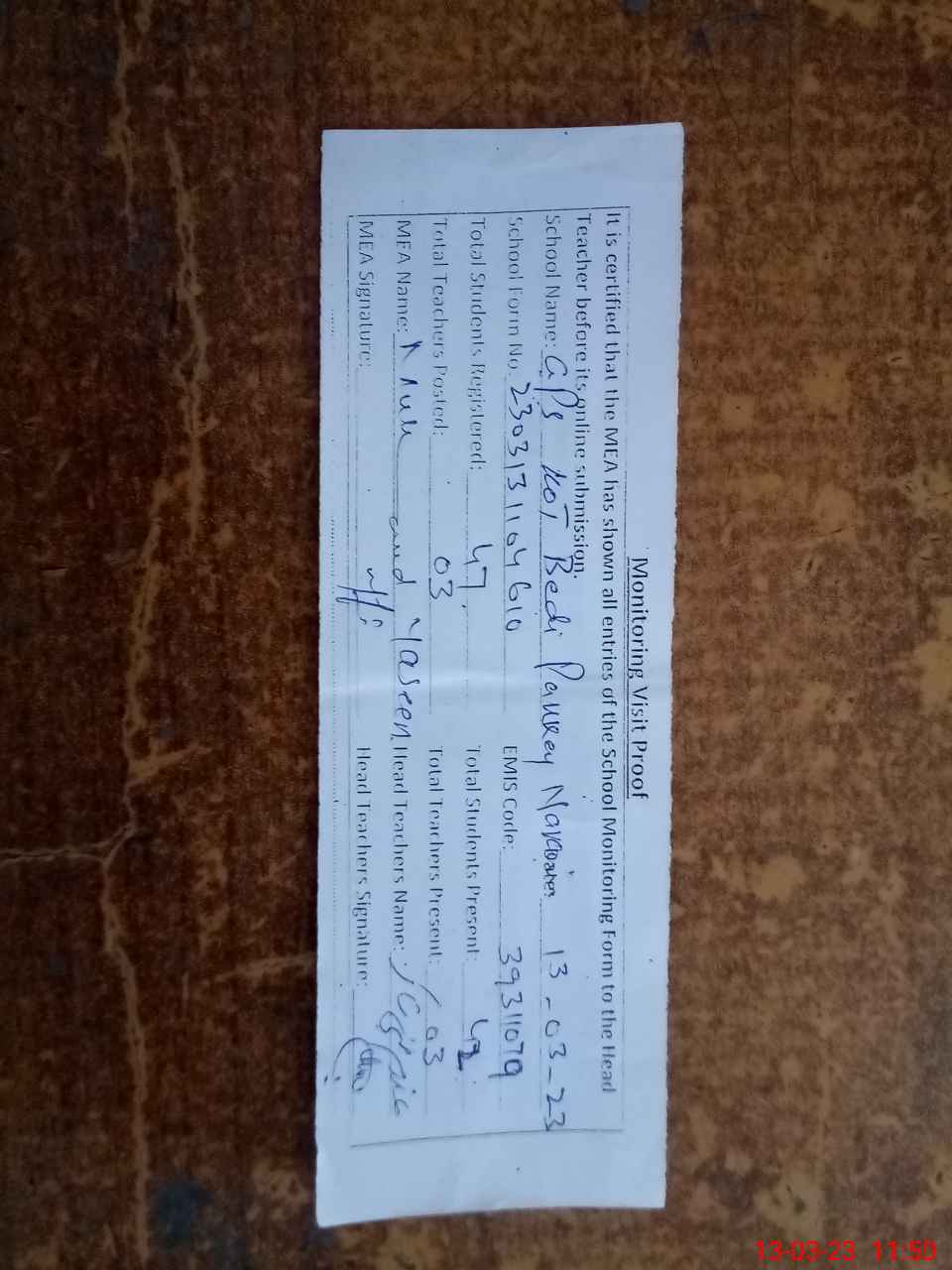 | Attendance Register | Head Teacher | MEA with School | Visit Proof |