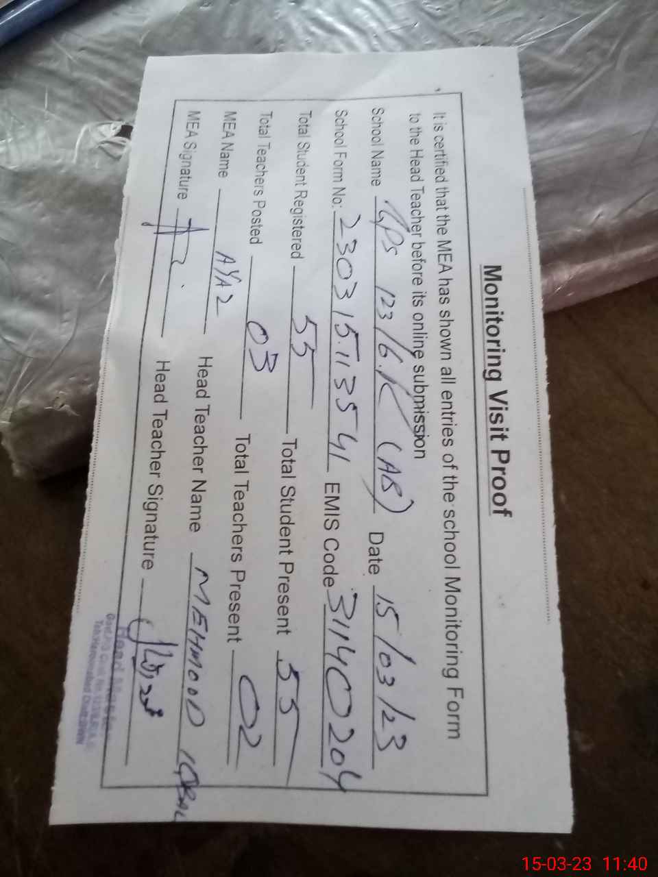 | EMIS Code: 31140204 | Name of School: GPS CHAK NO 123/6-R (A-B) | |||