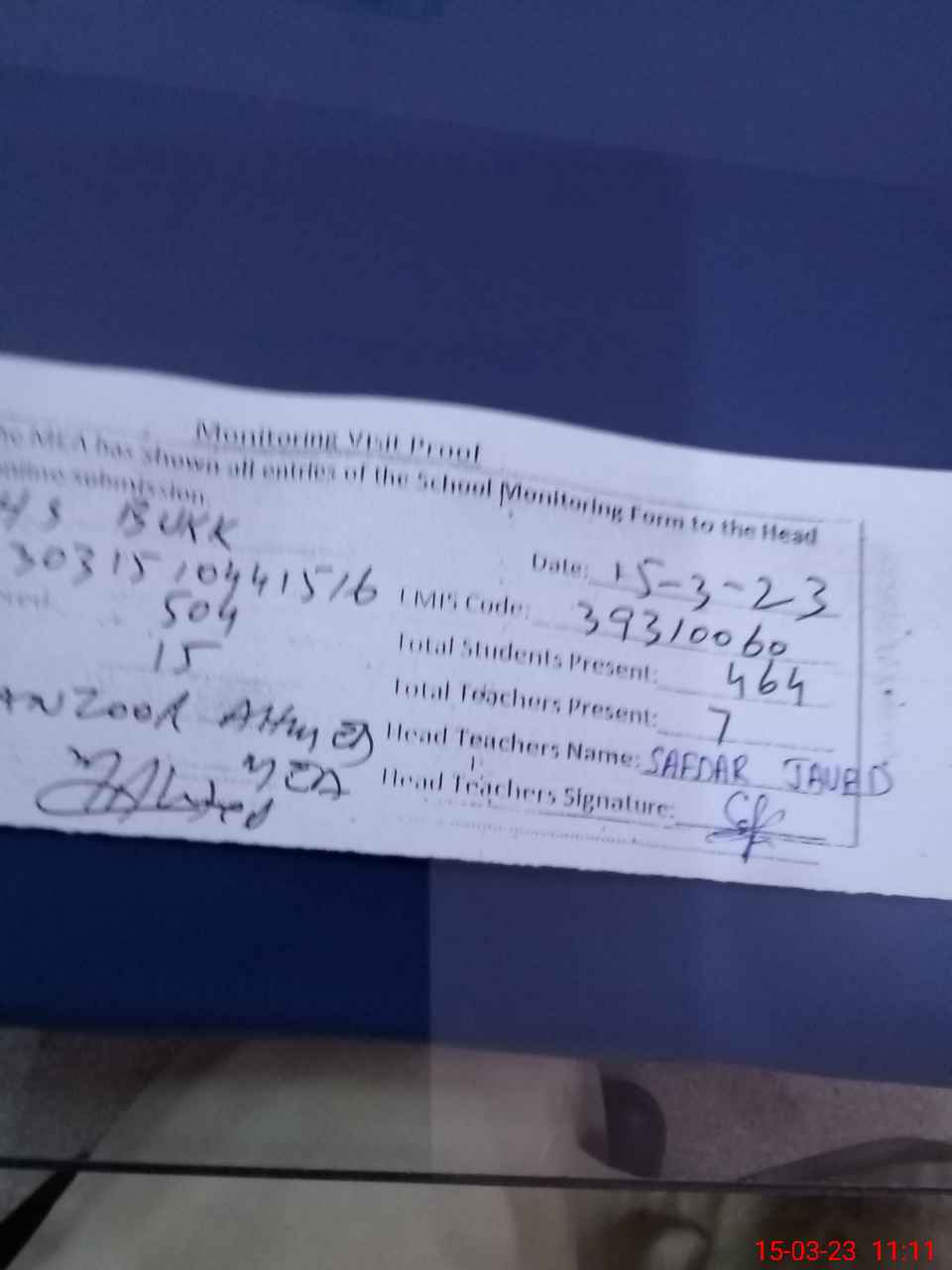 | Name: SA**** JA**** Designation: (School Headmaster's/Headmistress's) H M Phone/Cell Number: 03**** |