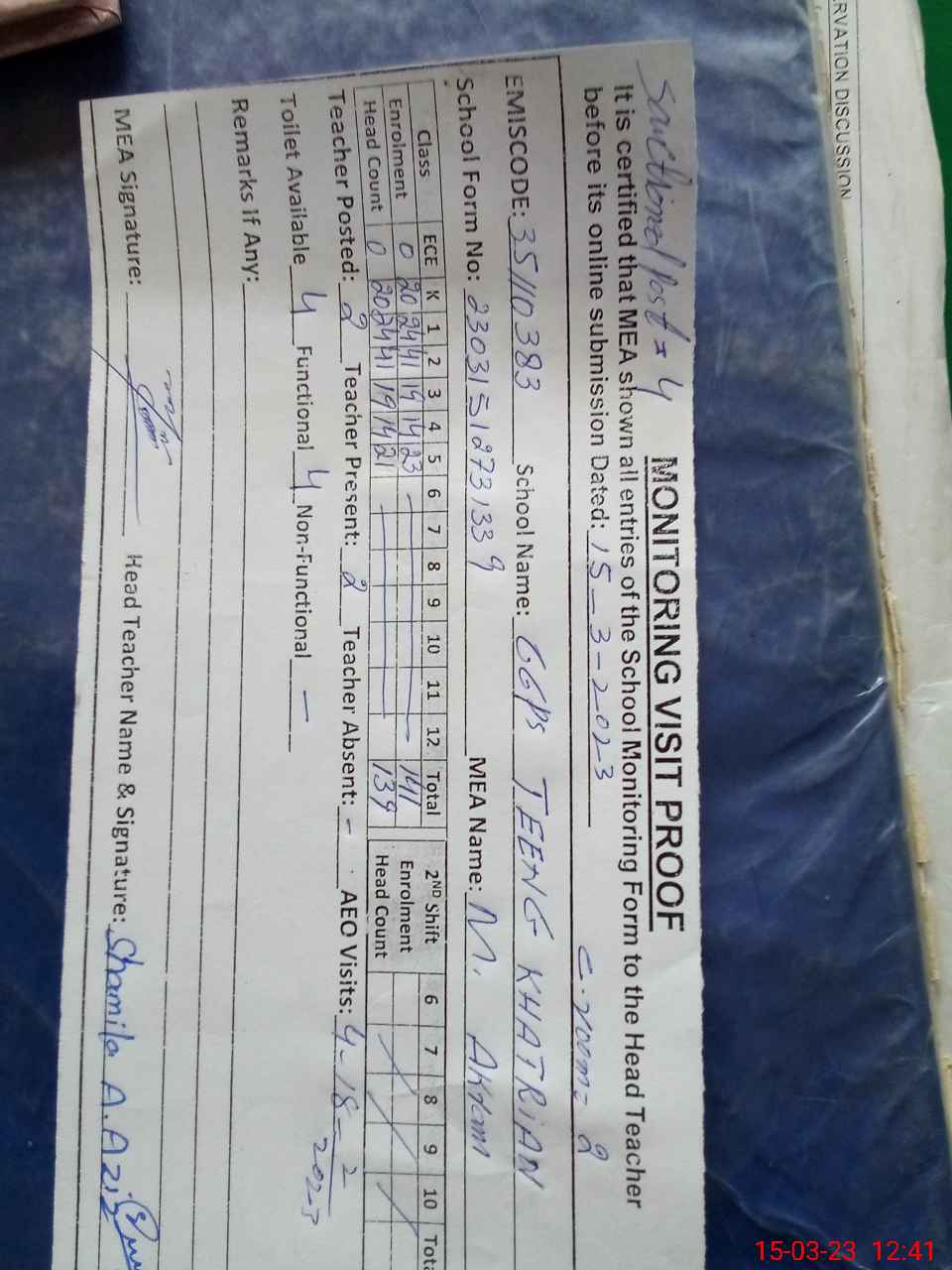 | Attendance Register | Head Teacher | MEA with School | Visit Proof |