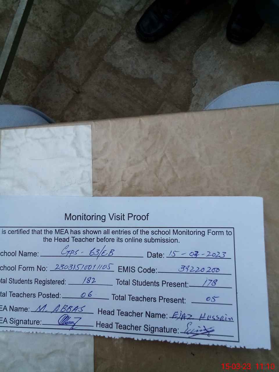 | Attendance Register | Head Teacher | MEA with School | Visit Proof |