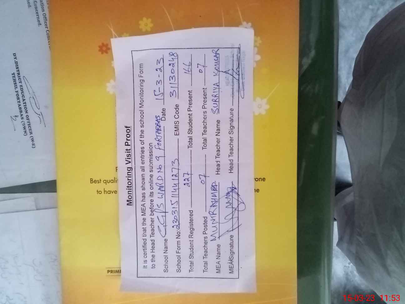 | Attendance Register | Head Teacher | MEA with School | Visit Proof |