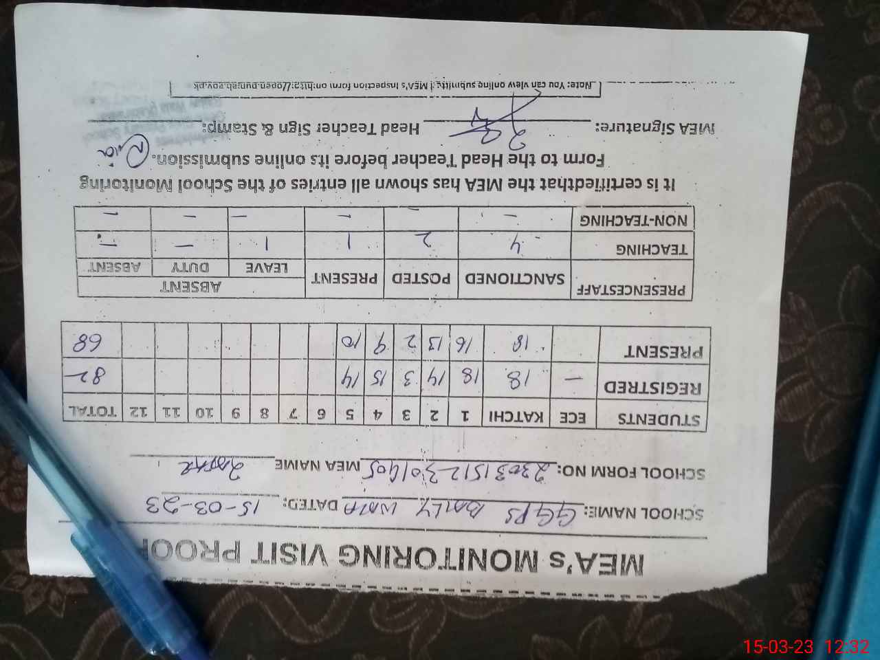 | Attendance Register | Head Teacher | MEA with School | Visit Proof |