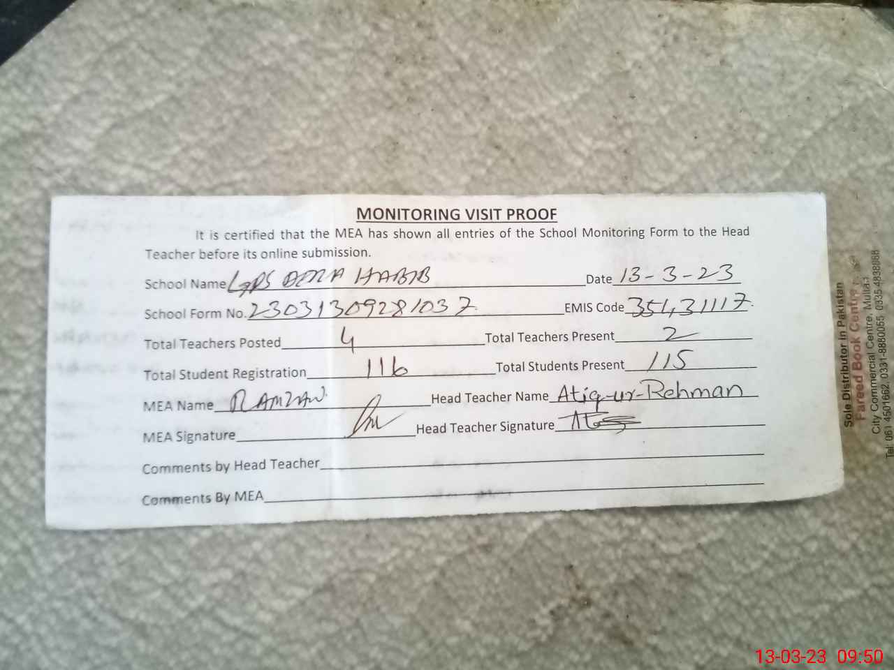 | Attendance Register | Head Teacher | MEA with School | Visit Proof |