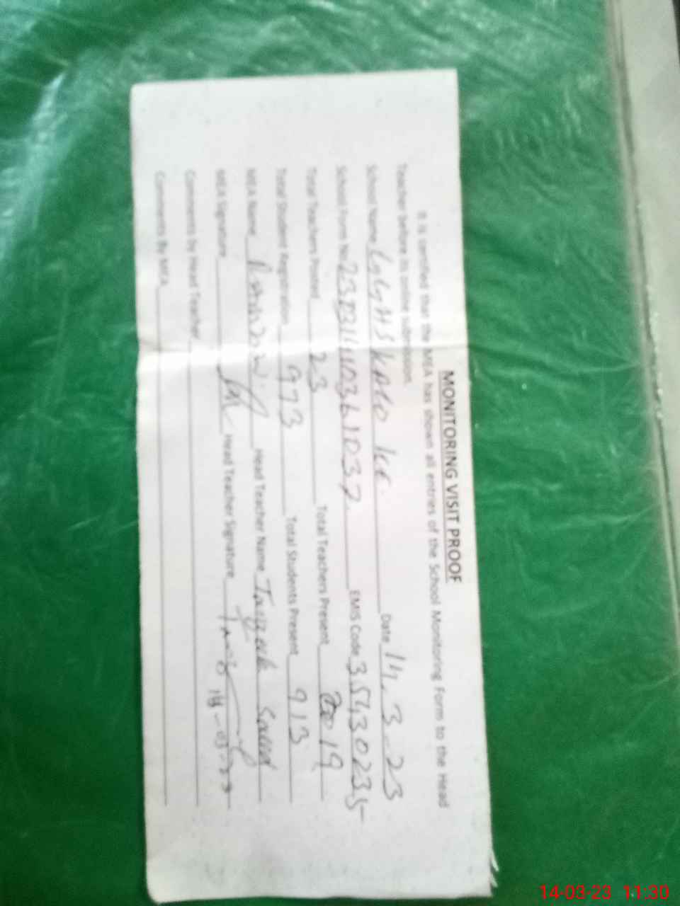 | Attendance Register | Head Teacher | MEA with School | Visit Proof |
