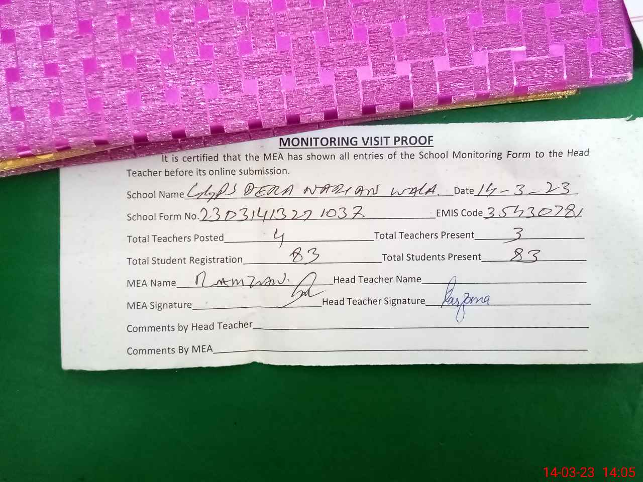 | Attendance Register | Head Teacher | MEA with School | Visit Proof |