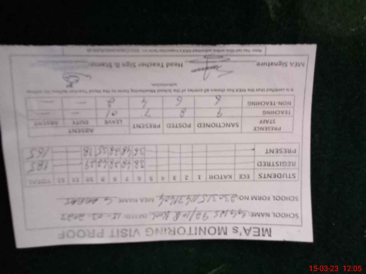 | Attendance Register | Head Teacher | MEA with School | Visit Proof |