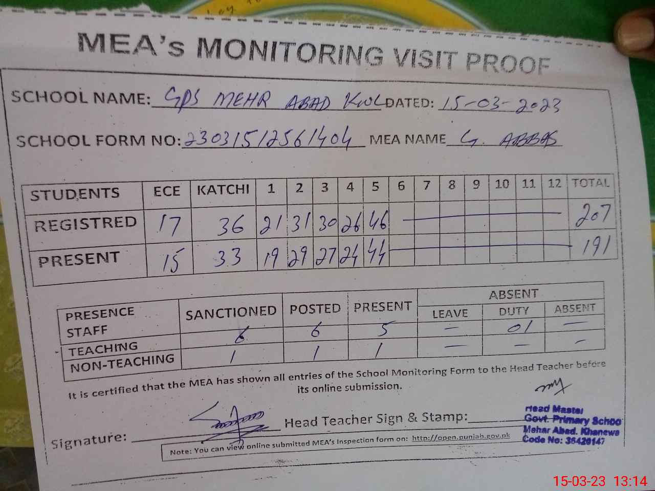 | Attendance Register | Head Teacher | MEA with School | Visit Proof |
