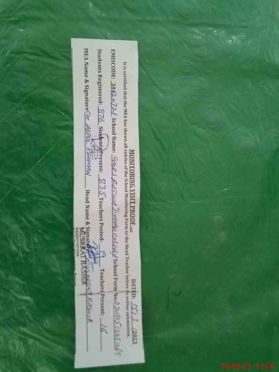 | Certified that this School was Inspected by the Undersigned MEA/DMO Today and the Information Stated Above is as Per Record. | |||||