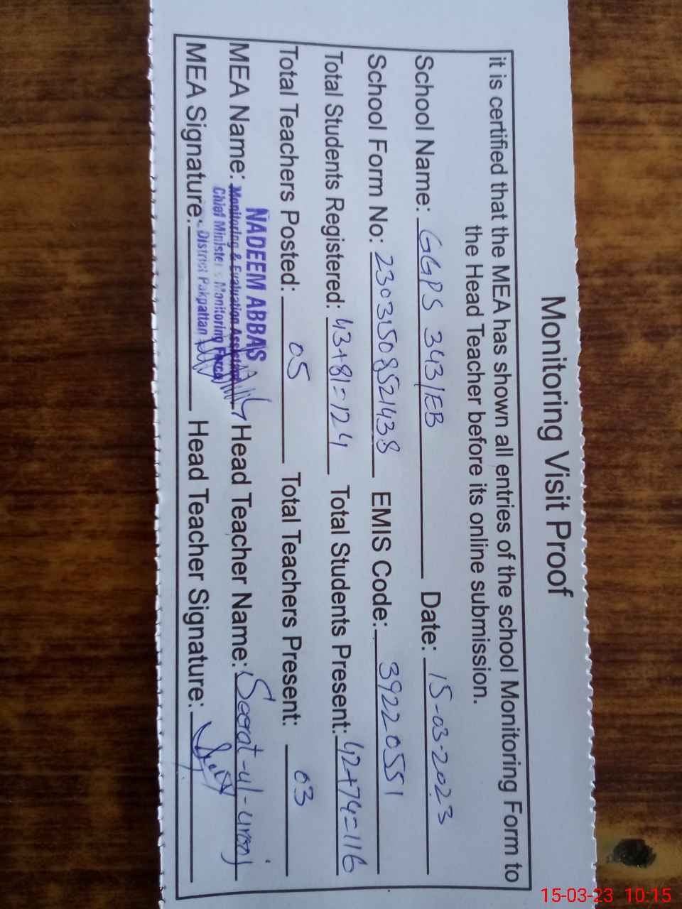 | Attendance Register | Head Teacher | MEA with School | Visit Proof |