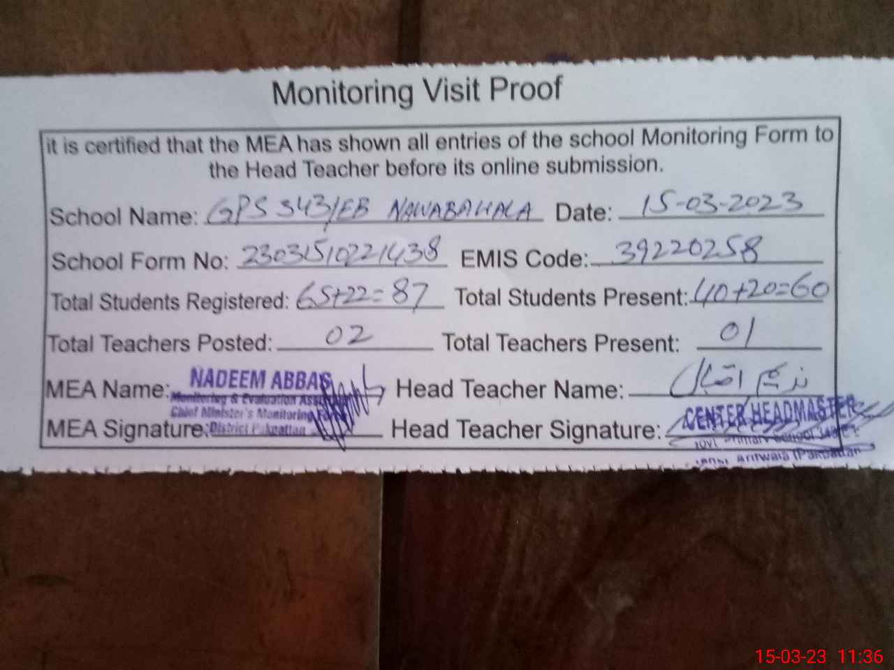 | EMIS Code: 39220258 | Name of School: GPS 343 EB NAWABAWALA | |||