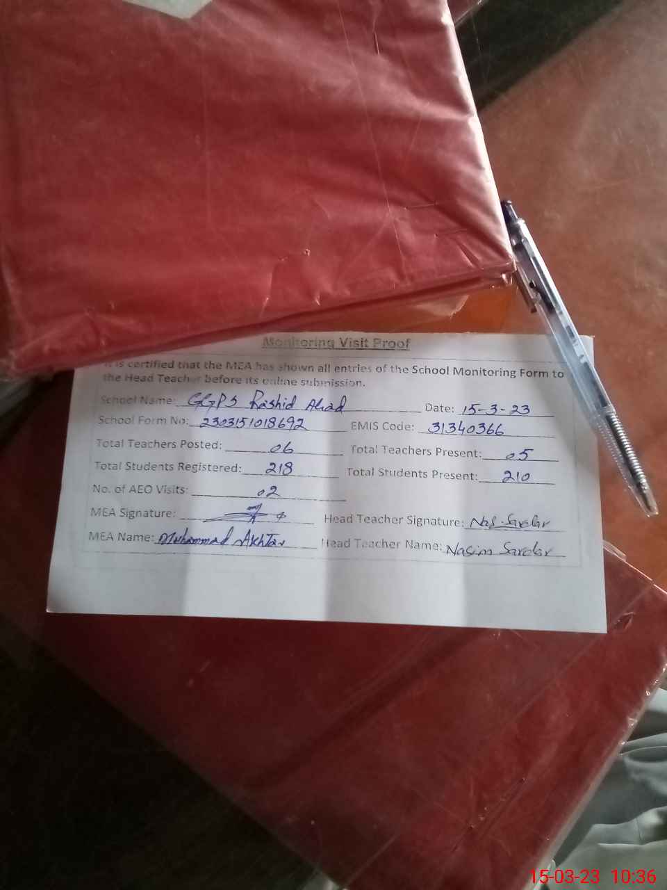 | Attendance Register | Head Teacher | MEA with School | Visit Proof |