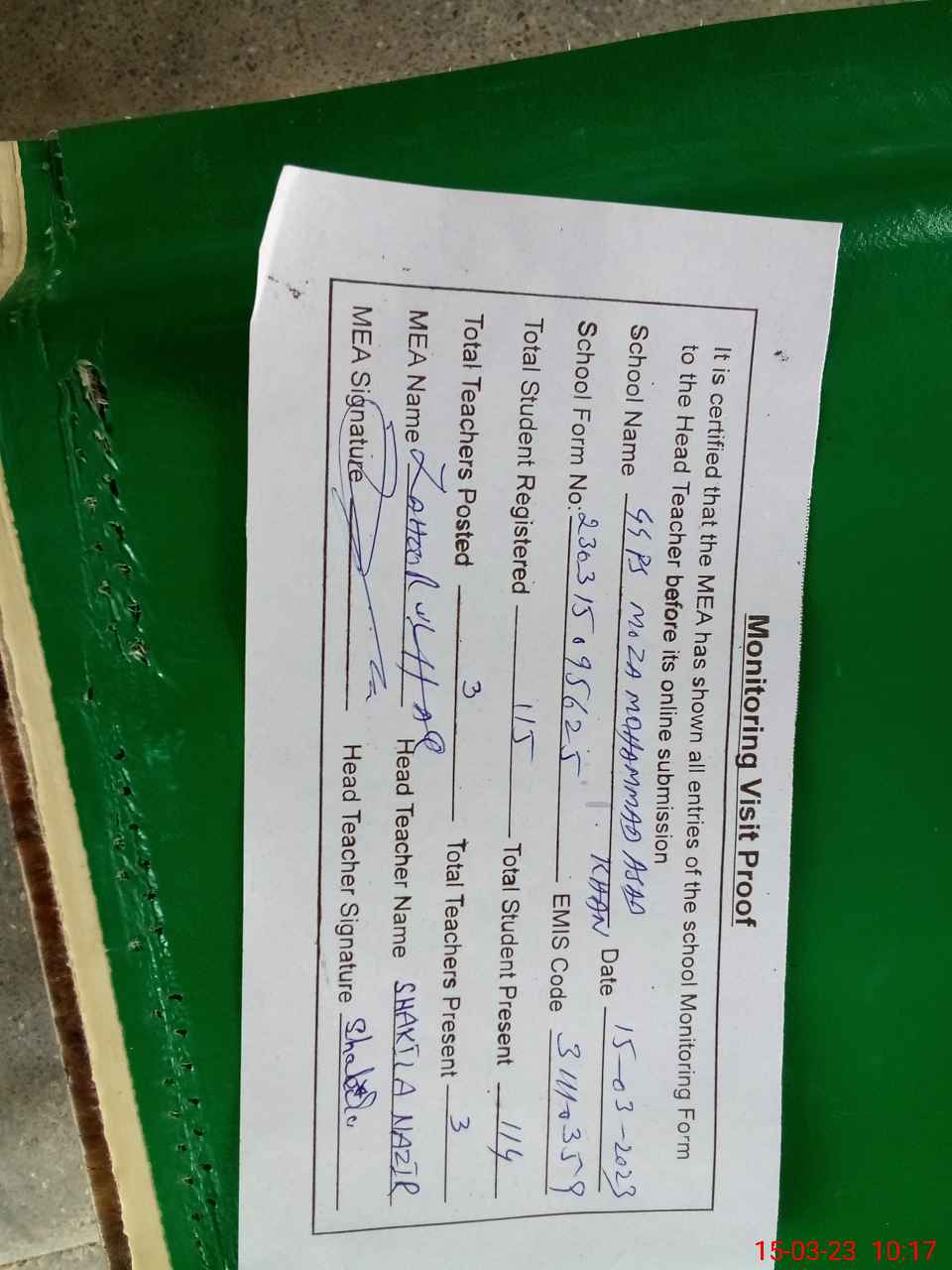 | Attendance Register | Head Teacher | MEA with School | Visit Proof |