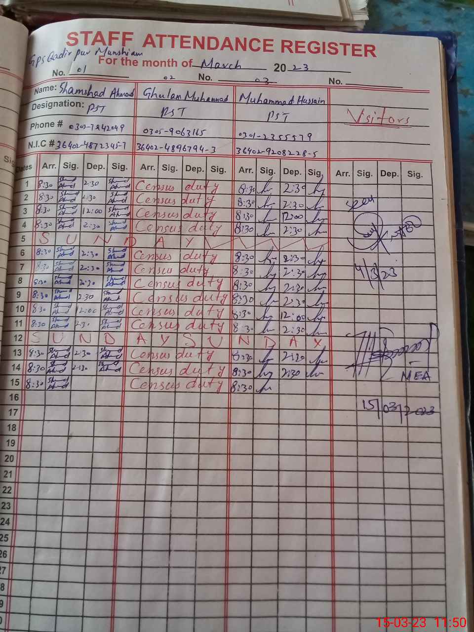 | Name: SH**** AH**** Designation: (School Headmaster's/Headmistress's) PST Phone/Cell Number: 03**** |