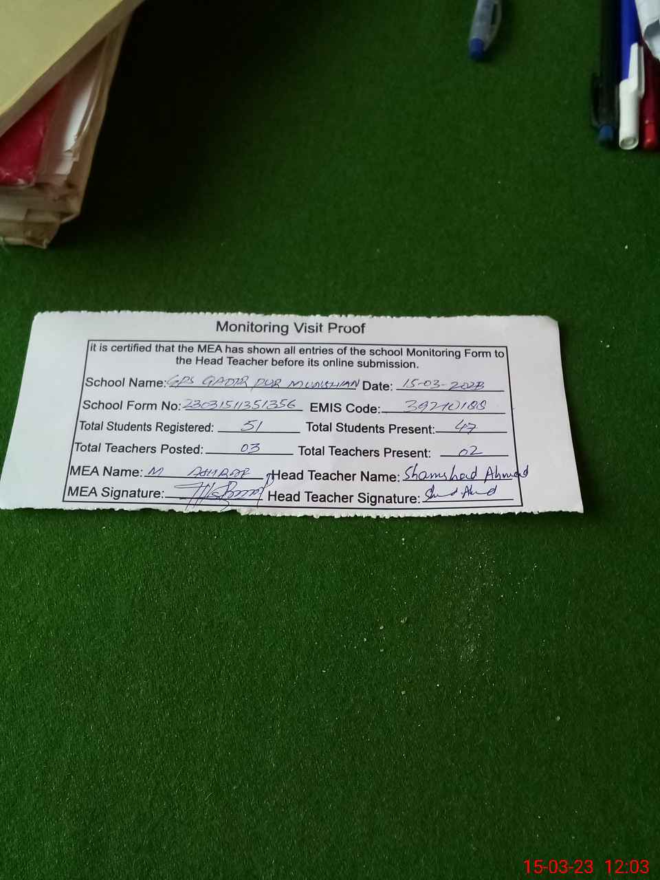 | Attendance Register | Head Teacher | MEA with School | Visit Proof |