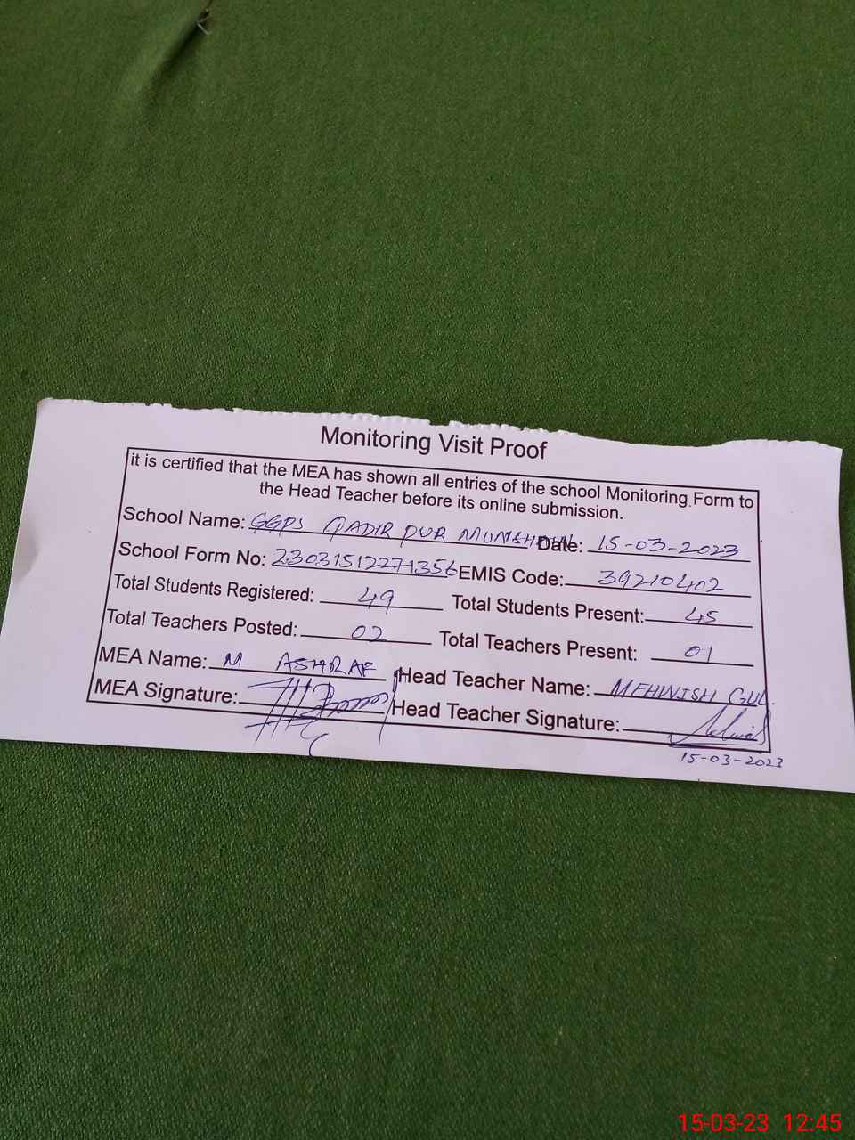 | EMIS Code: 39210402 | Name of School: GGPS QADIR PUR MUNSHIAN | |||