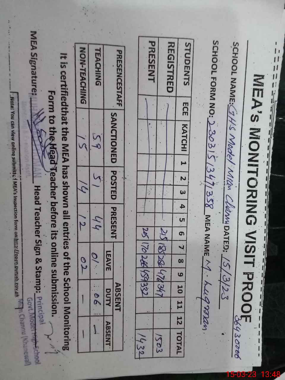 | Attendance Register | Head Teacher | MEA with School | Visit Proof |