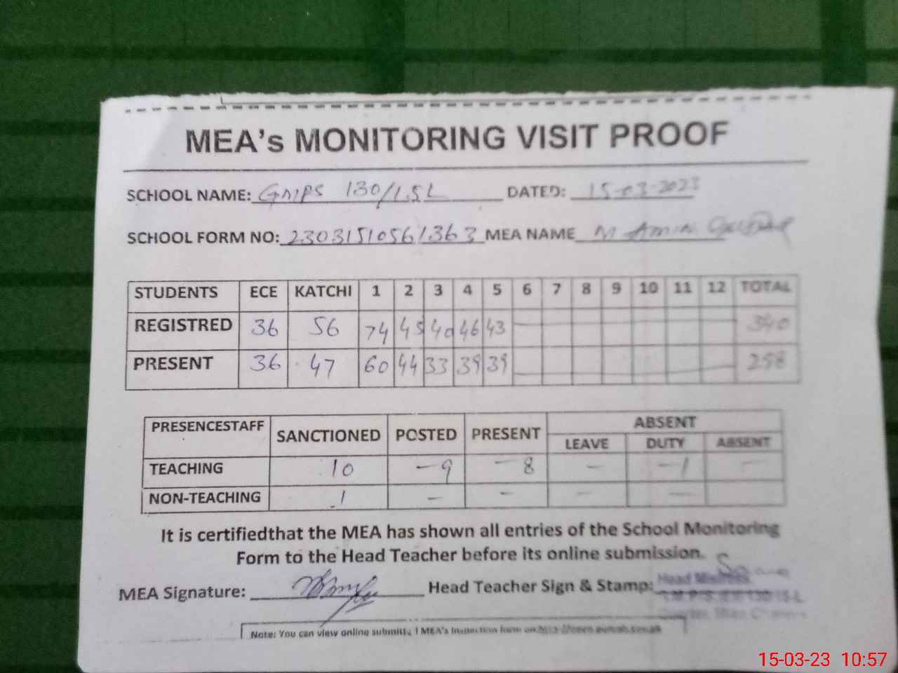 | Attendance Register | Head Teacher | MEA with School | Visit Proof |