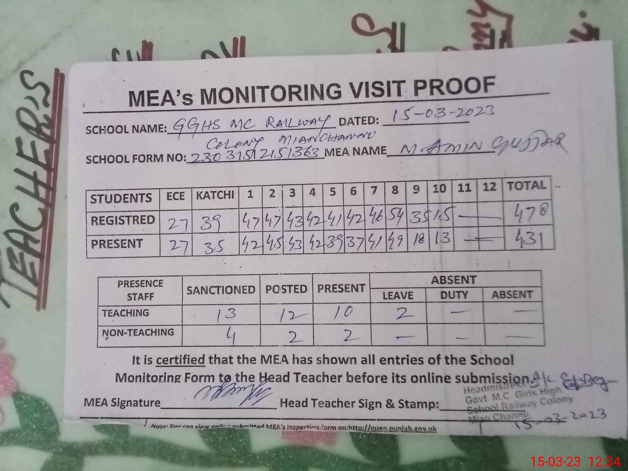 | EMIS Code: 36430076 | Name of School: GGHS MC RAILWAY COLONY, MIAN CHANNU | |||