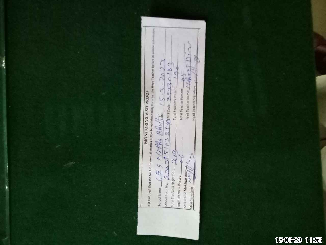 | Attendance Register | Head Teacher | MEA with School | Visit Proof |