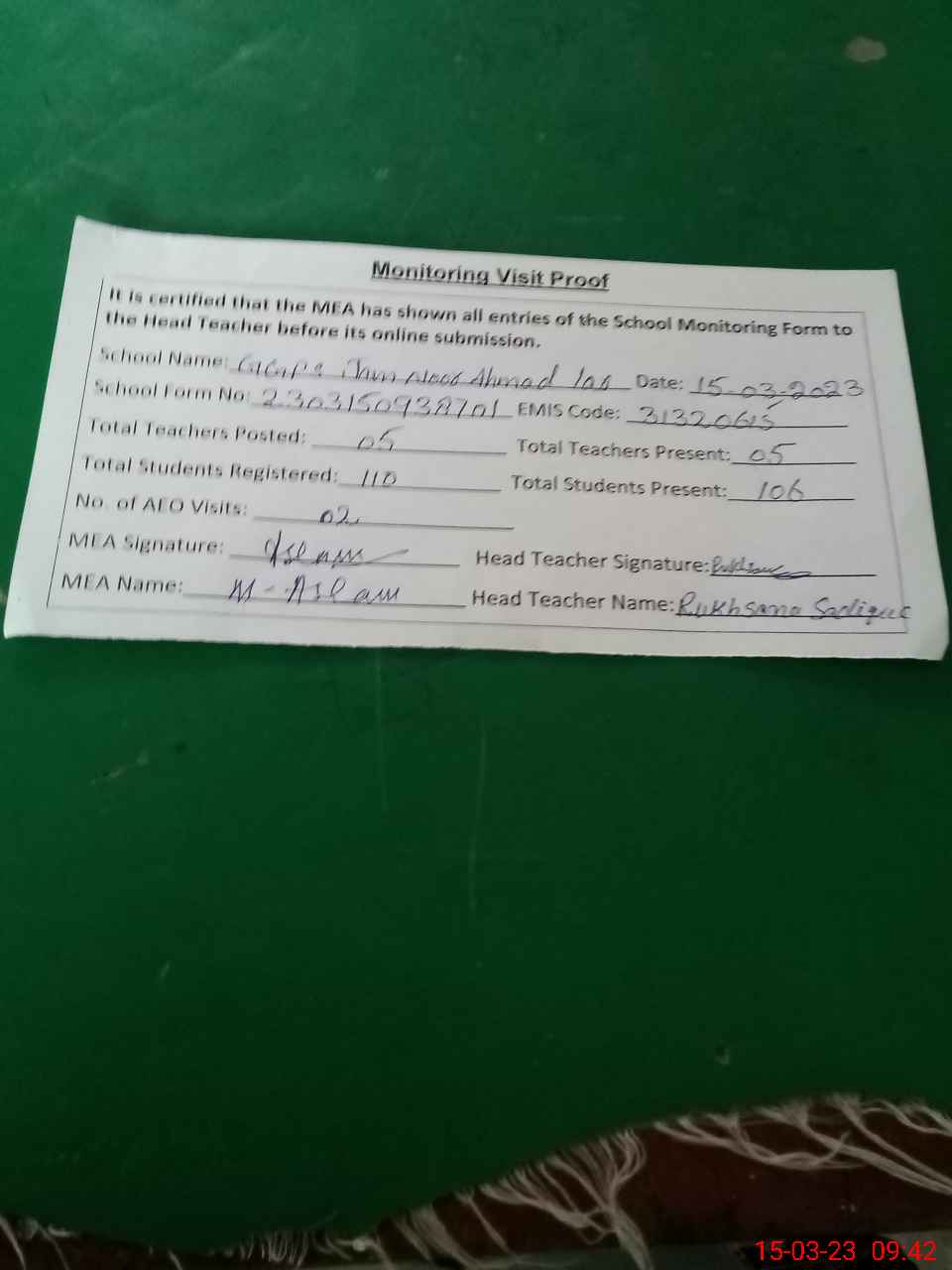 | Attendance Register | Head Teacher | MEA with School | Visit Proof |