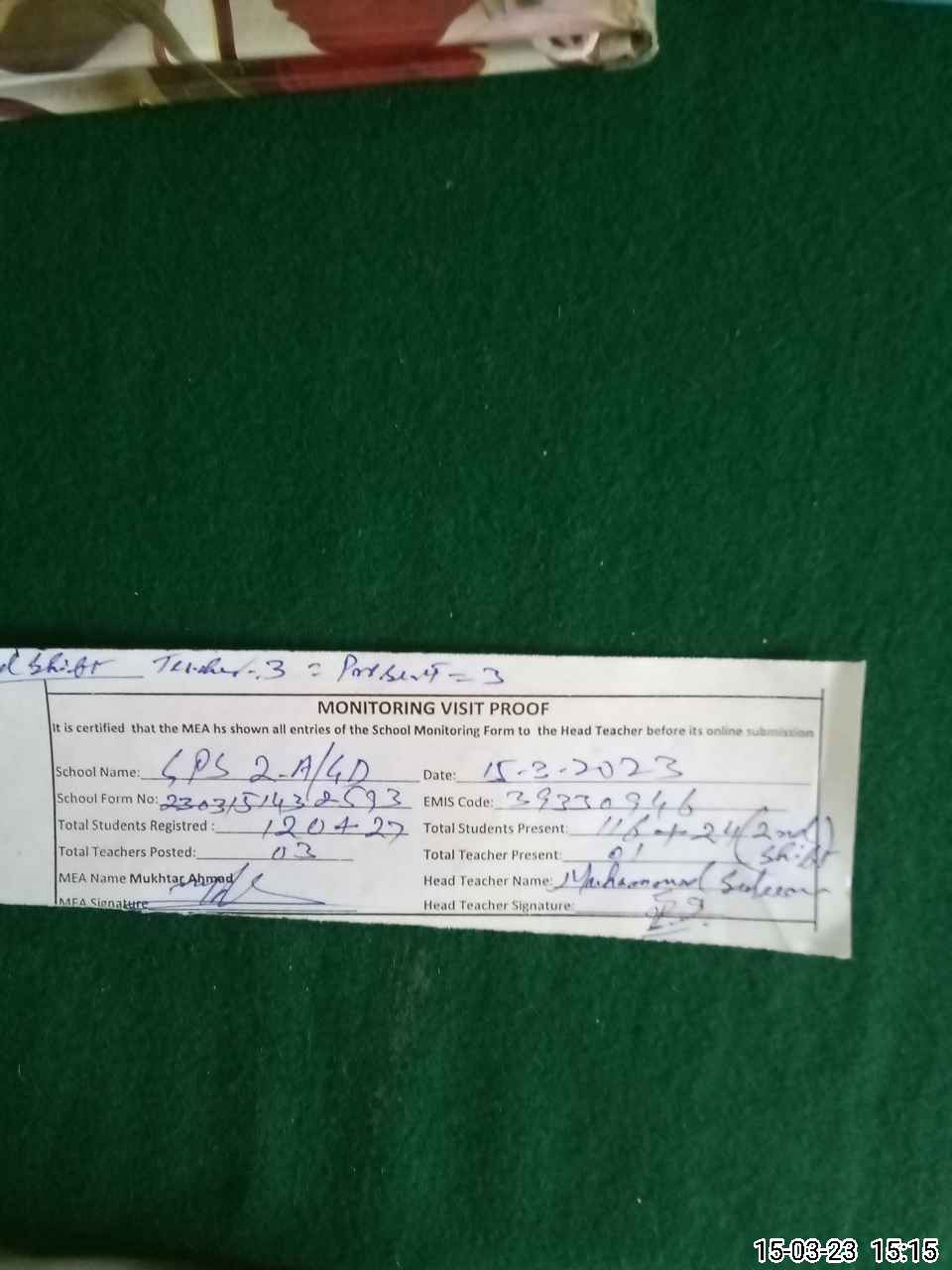 | Attendance Register | Head Teacher | MEA with School | Visit Proof |