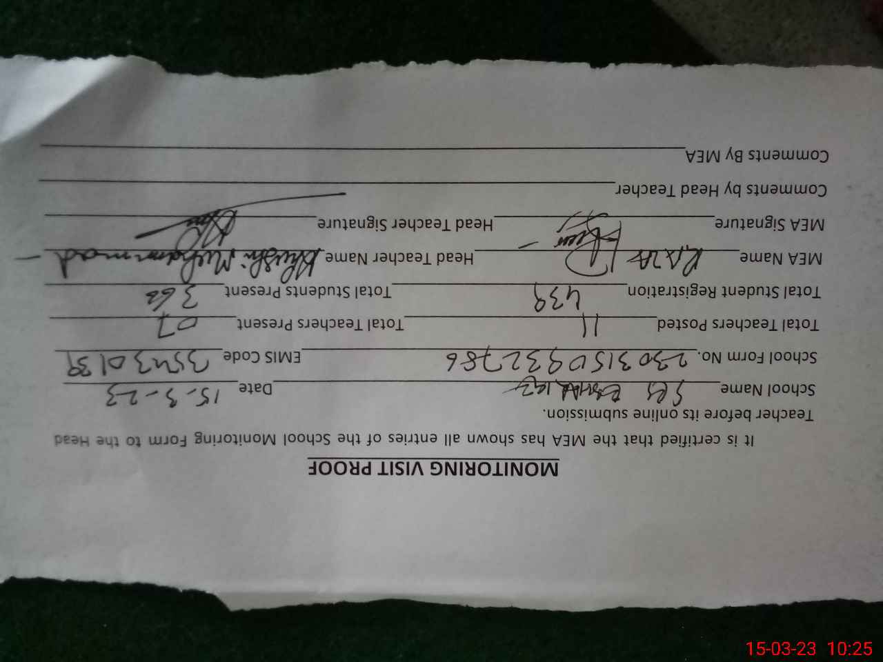 | Attendance Register | Head Teacher | MEA with School | Visit Proof |
