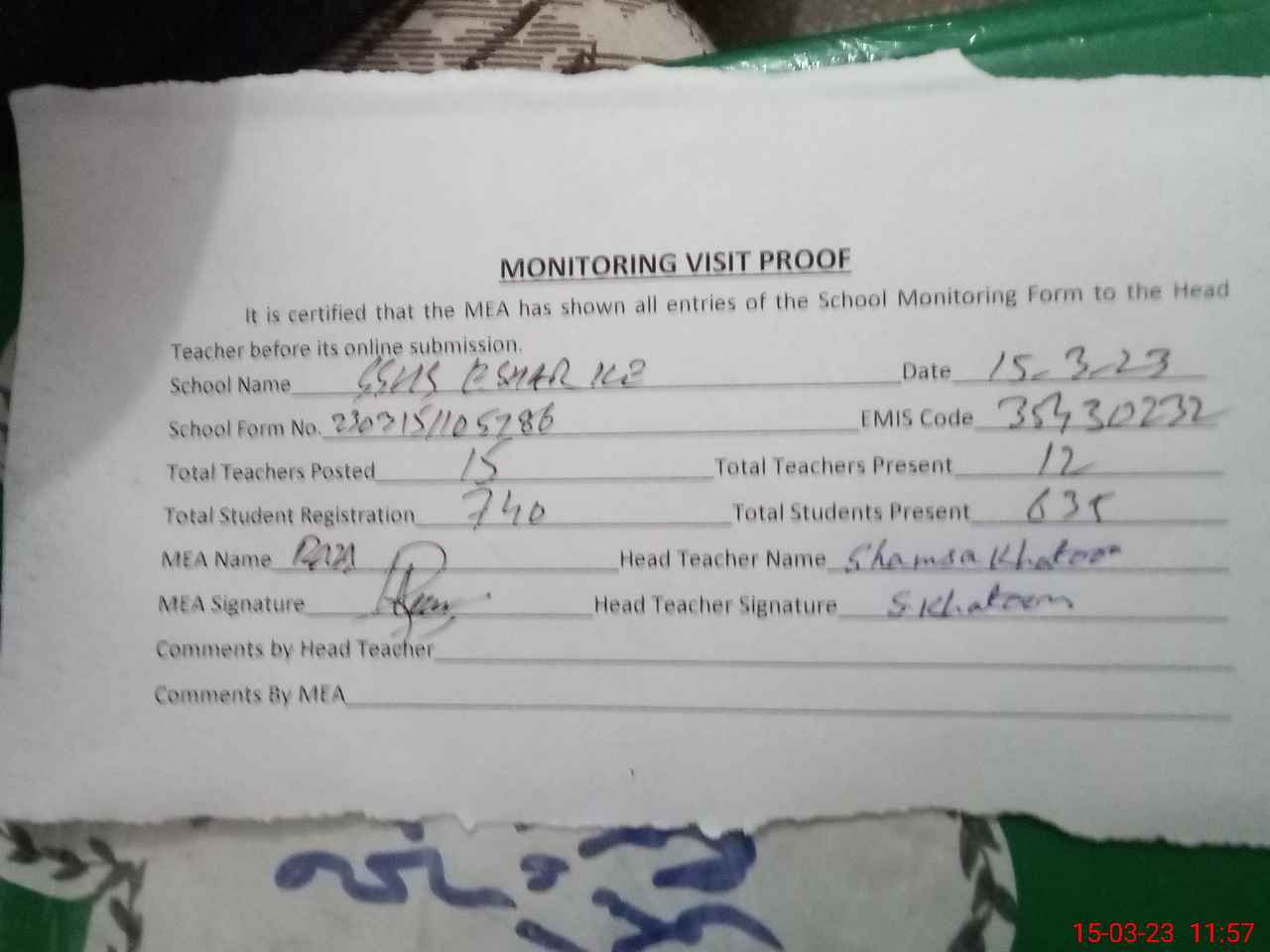 | Attendance Register | Head Teacher | MEA with School | Visit Proof |
