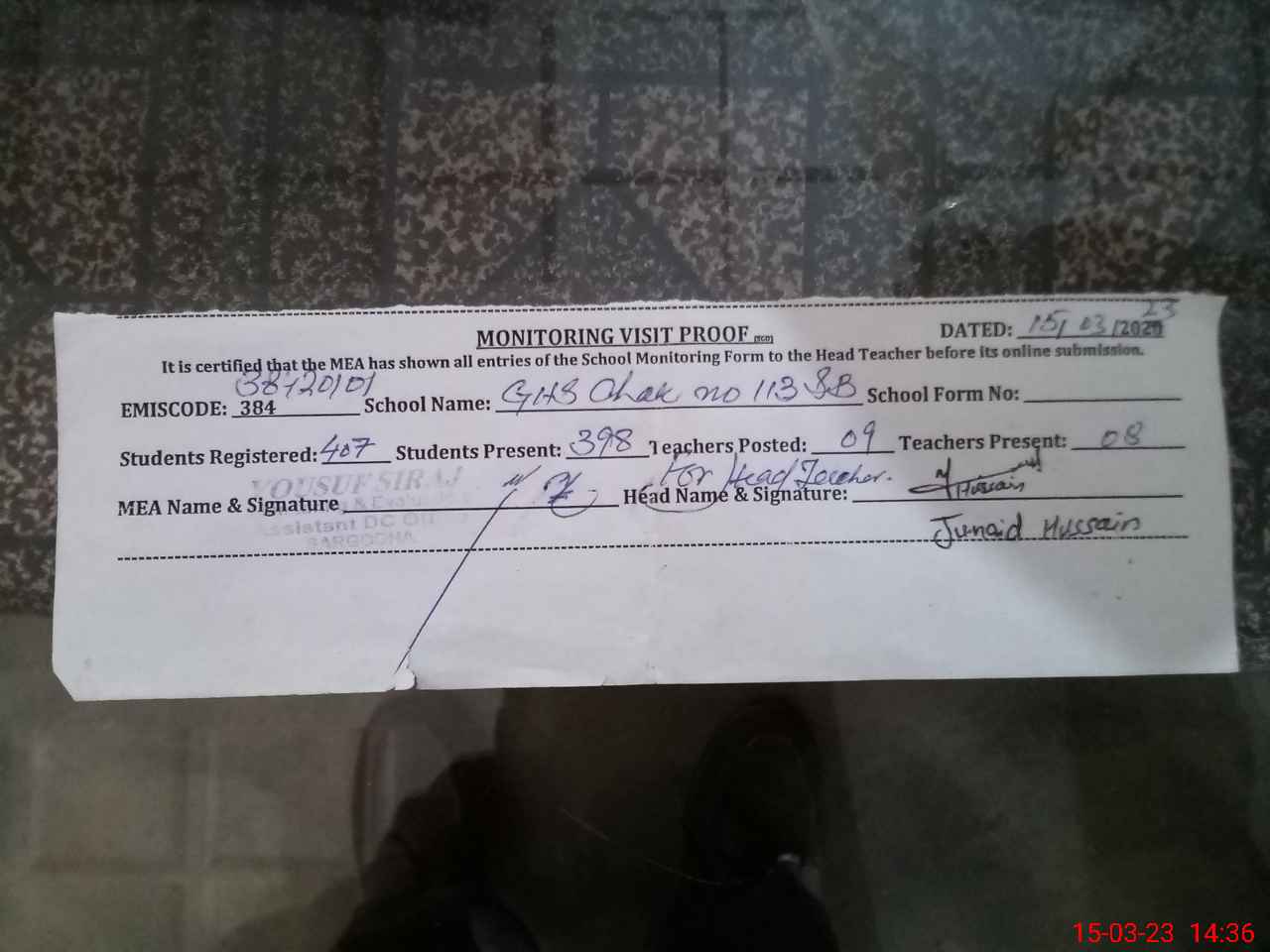 | EMIS Code: 38420101 | Name of School: GHS CHAK NO.113 SB | |||