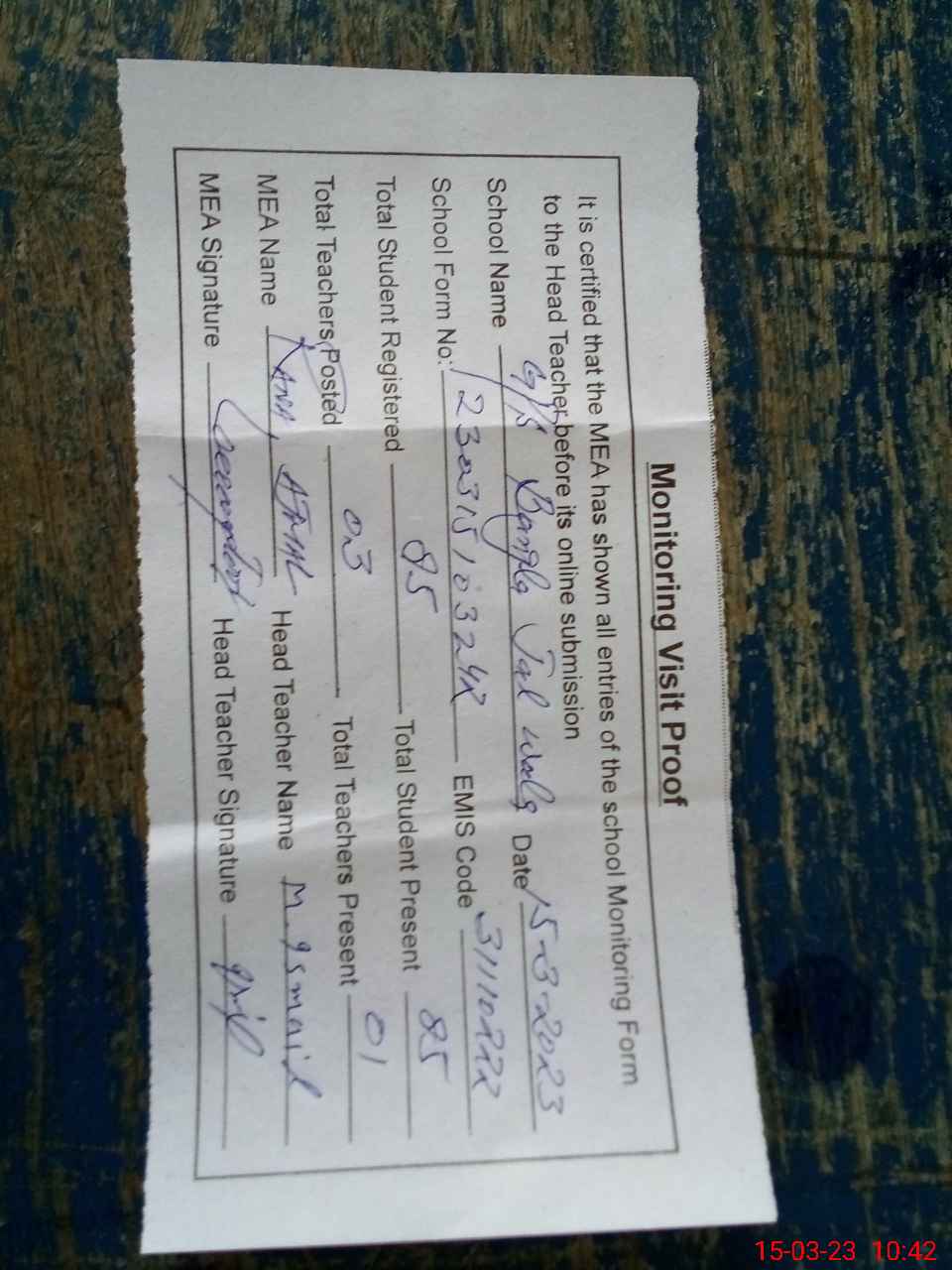 | Attendance Register | Head Teacher | MEA with School | Visit Proof |