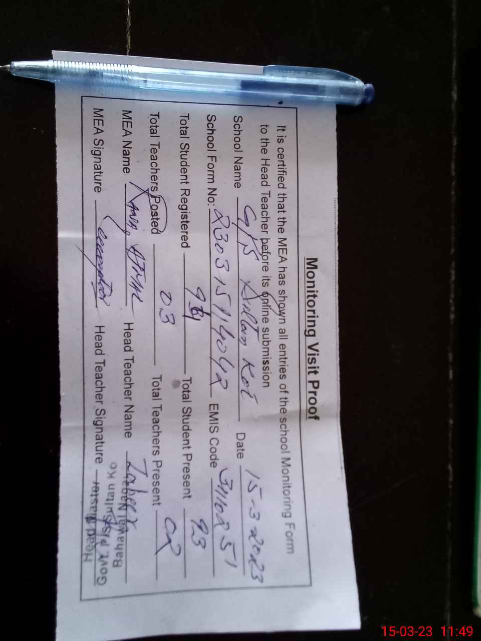 | Attendance Register | Head Teacher | MEA with School | Visit Proof |